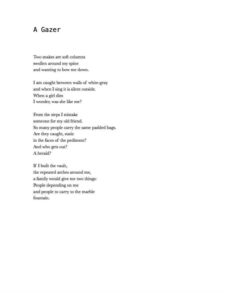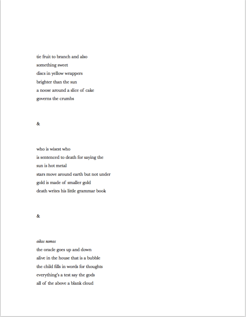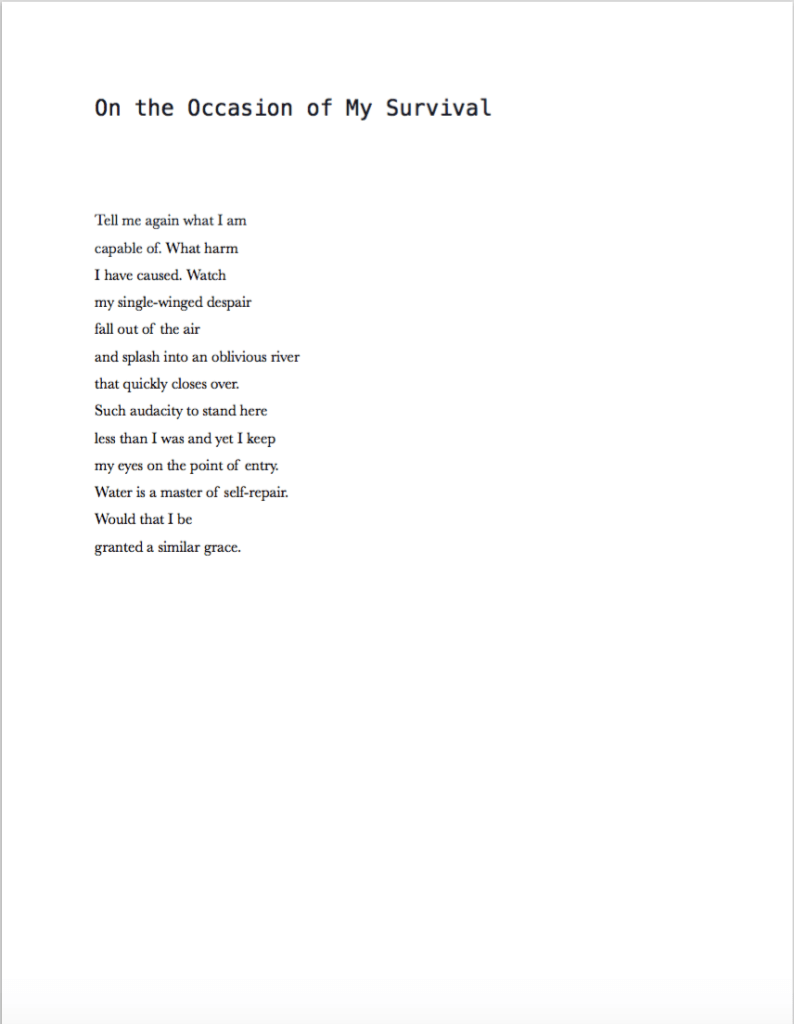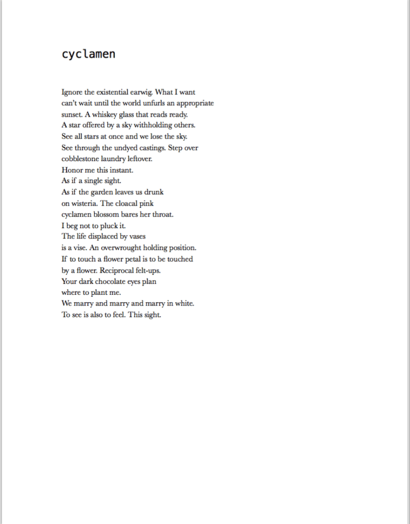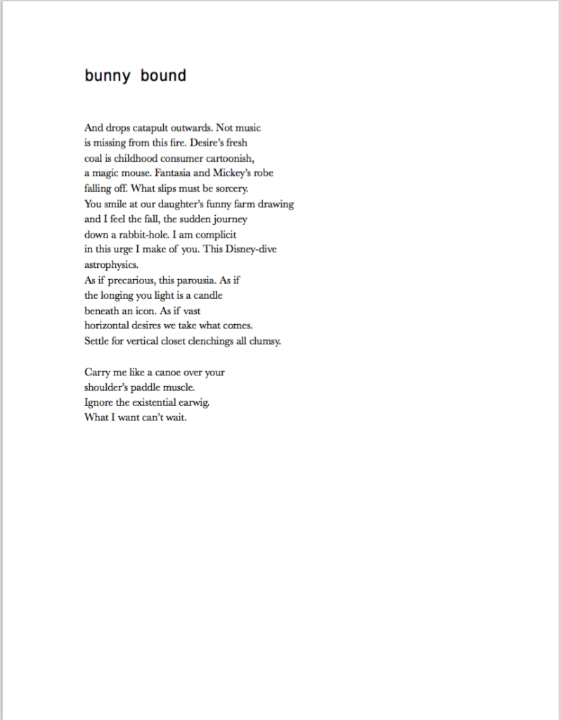 ELIZABETH ONUSKO is the author of Portrait of the Future with Trapdoor (Red Paint Hill, 2016). Her work has recently appeared or is forthcoming in Witness, Best New Poets 2015, Conduit, DIAGRAM, Sixth Finch, The Awl, and Redivider, among others. She is the editor of Foundry and assistant editor of inter|rupture. Her website is elizabethonusko.com.