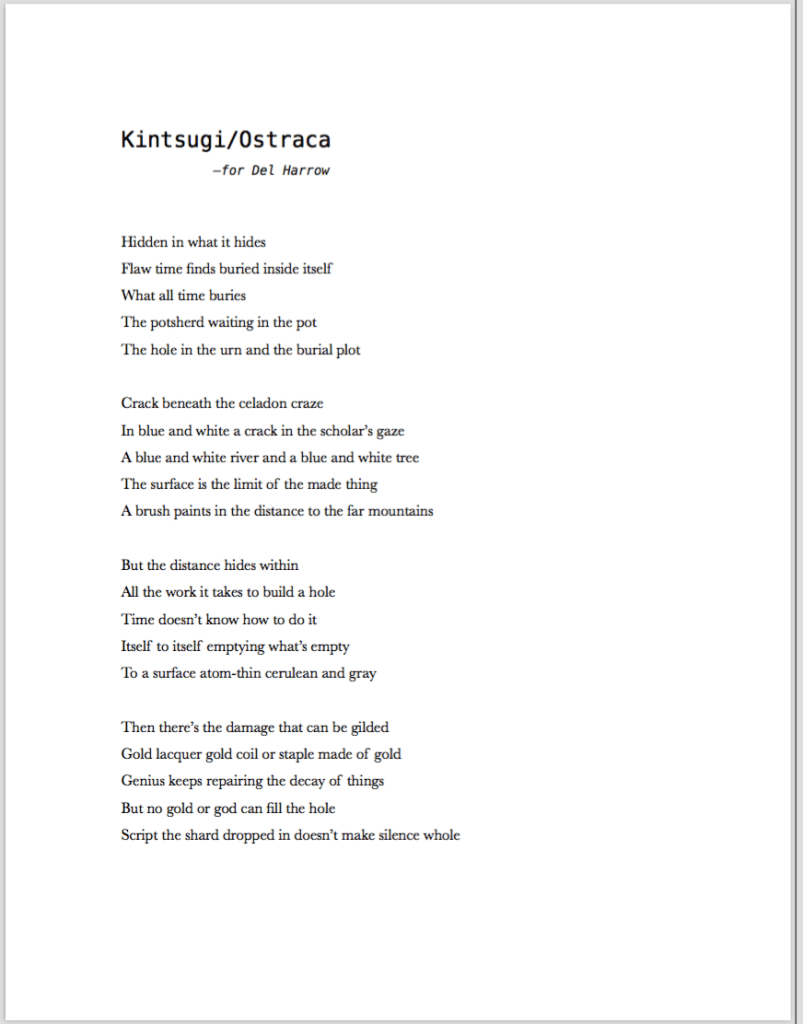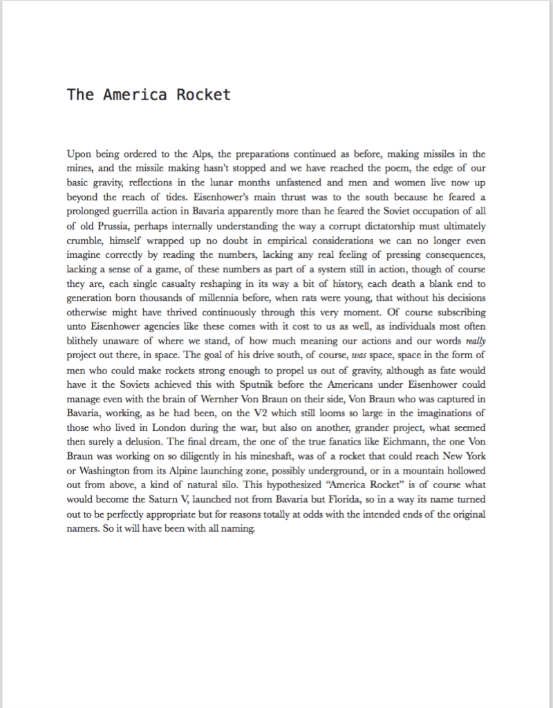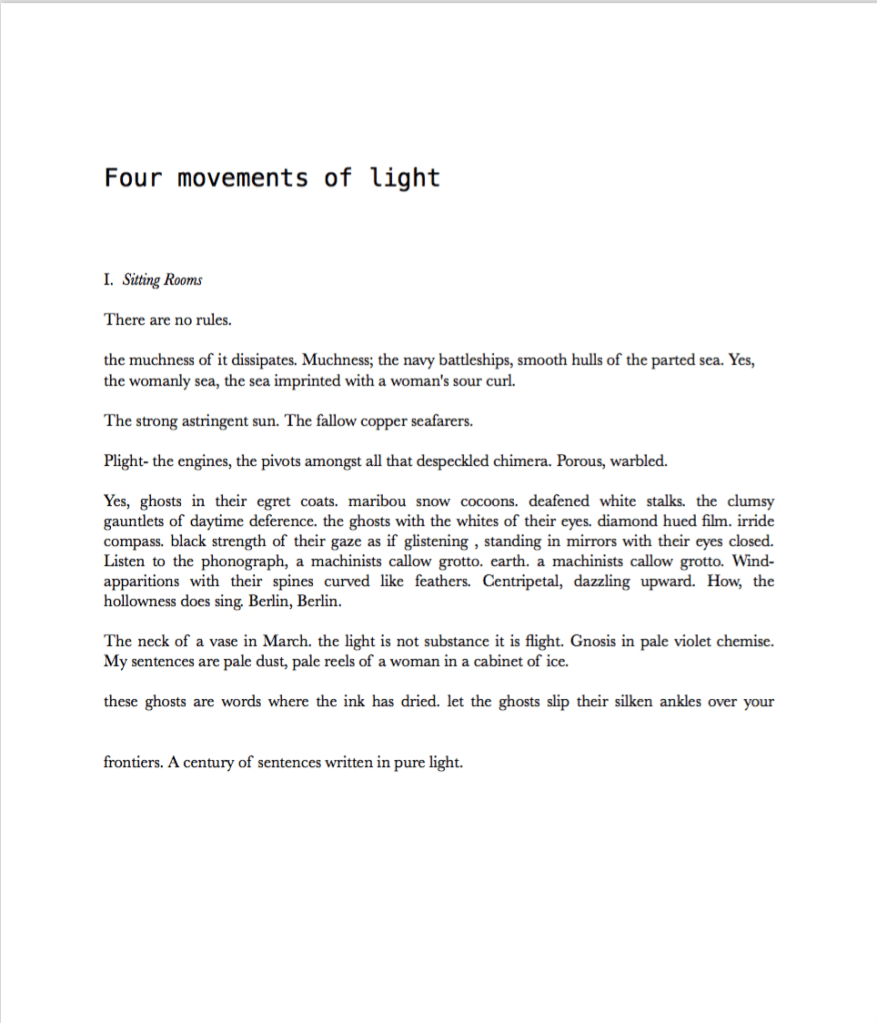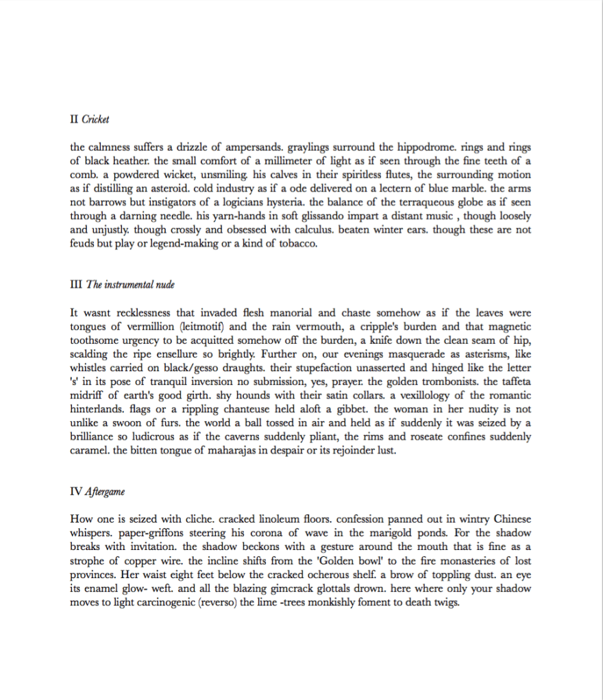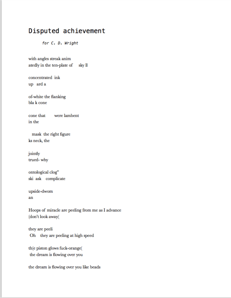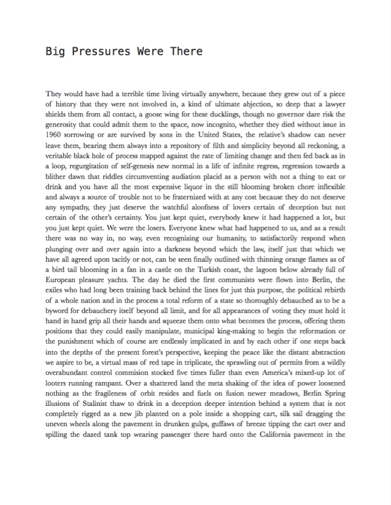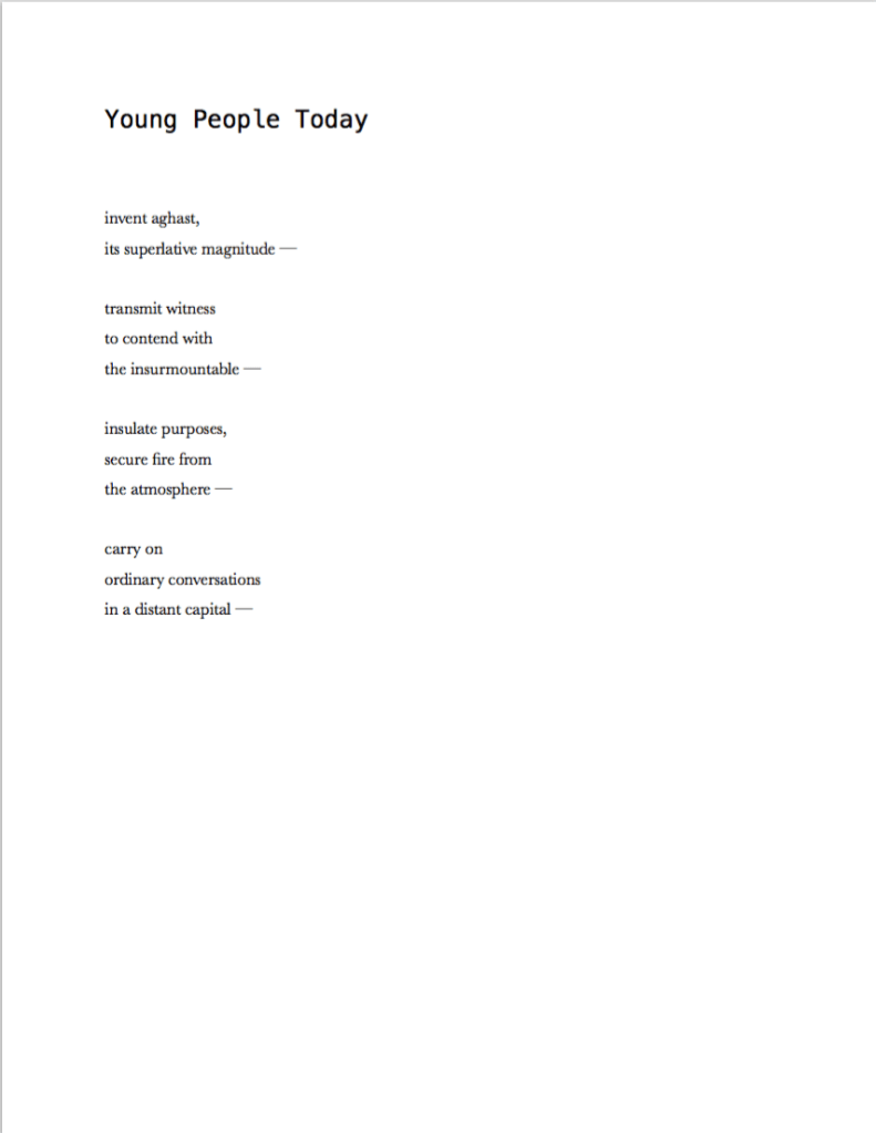 STU WATSON is a writer, musician, and teacher living in Brooklyn. A founder and editor of Prelude, his work has appeared or is forthcoming at PANK, The Collapsar, Queen Mob’s Teahouse, Jacket 2, White Wall Review, and in the Brooklyn Poets Anthology. His manuscript ‘Communicatingroups’ was a finalist for the 2016 National Poetry Series. A PhD candidate in English Literature at The Graduate Center, CUNY, he teaches at John Jay College of Criminal Justice.