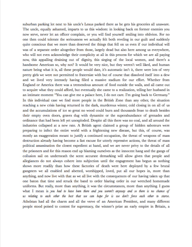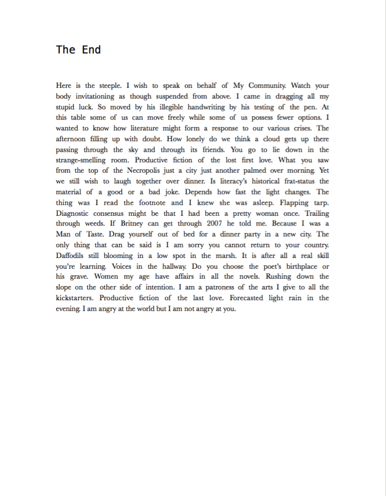 MC HYLAND is founding editor of DoubleCross Press, and is currently working on a dissertation on the poetics of the commons, as well as on an ongoing poetic research project on walking, friendship, and publishing. She is the author of the poetry collection Neveragainland and of several poetry chapbooks, most recently THE END PART ONE, forthcoming this summer from Magic Helicopter Press.