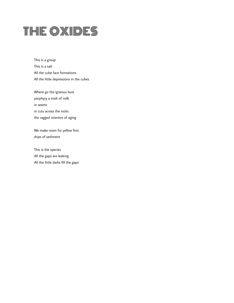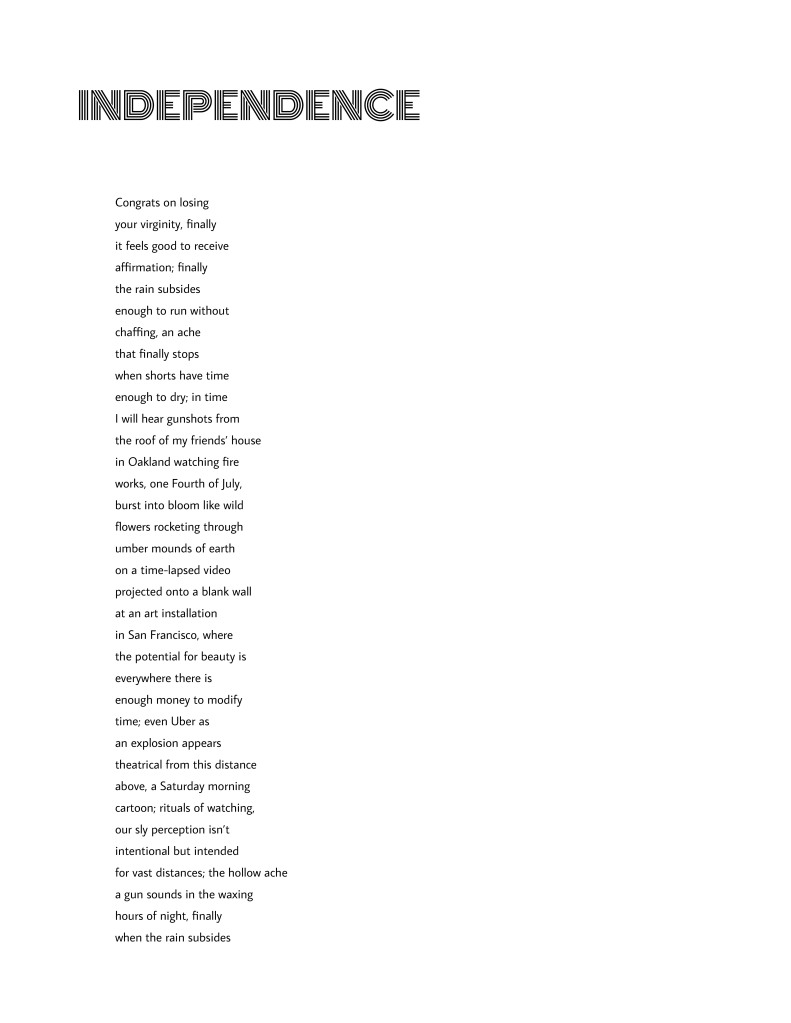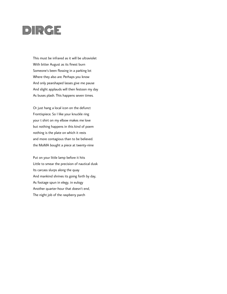 released July 2016 | poems by Robert C.L. Crawford, Melissa Eleftherion, Tirzah Goldenberg, Ryan Ikeda, Kristin Peterson, Marlan S, and Sarah Sloat