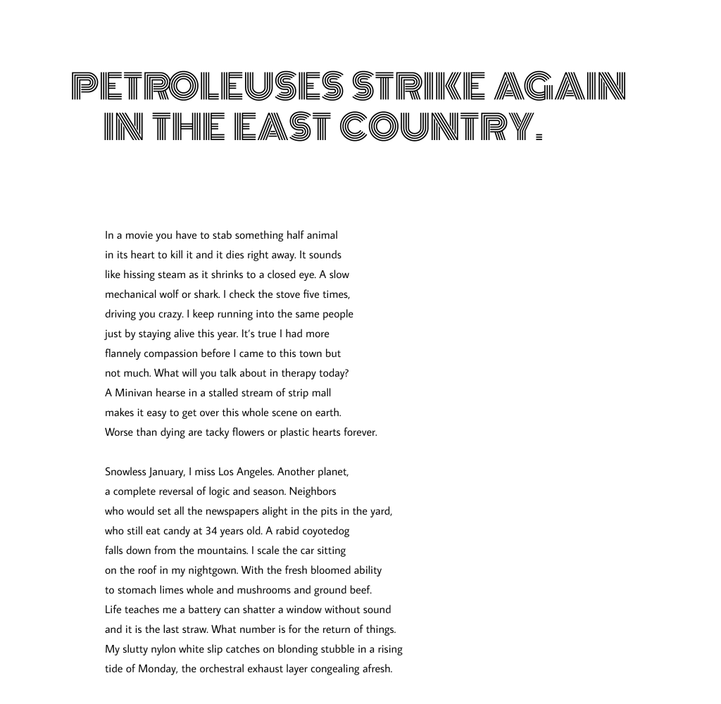 SARAH SLOAT lives in Germany. Some of her recent work has appeared in Radar, Word Riot and The Offing. Her most recent chapbook, “Heiress to a Small Ruin,” was published in early 2016 by Dancing Girl Press.