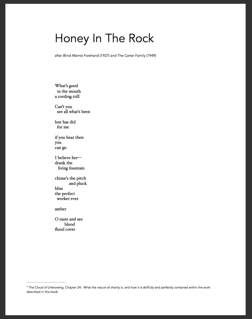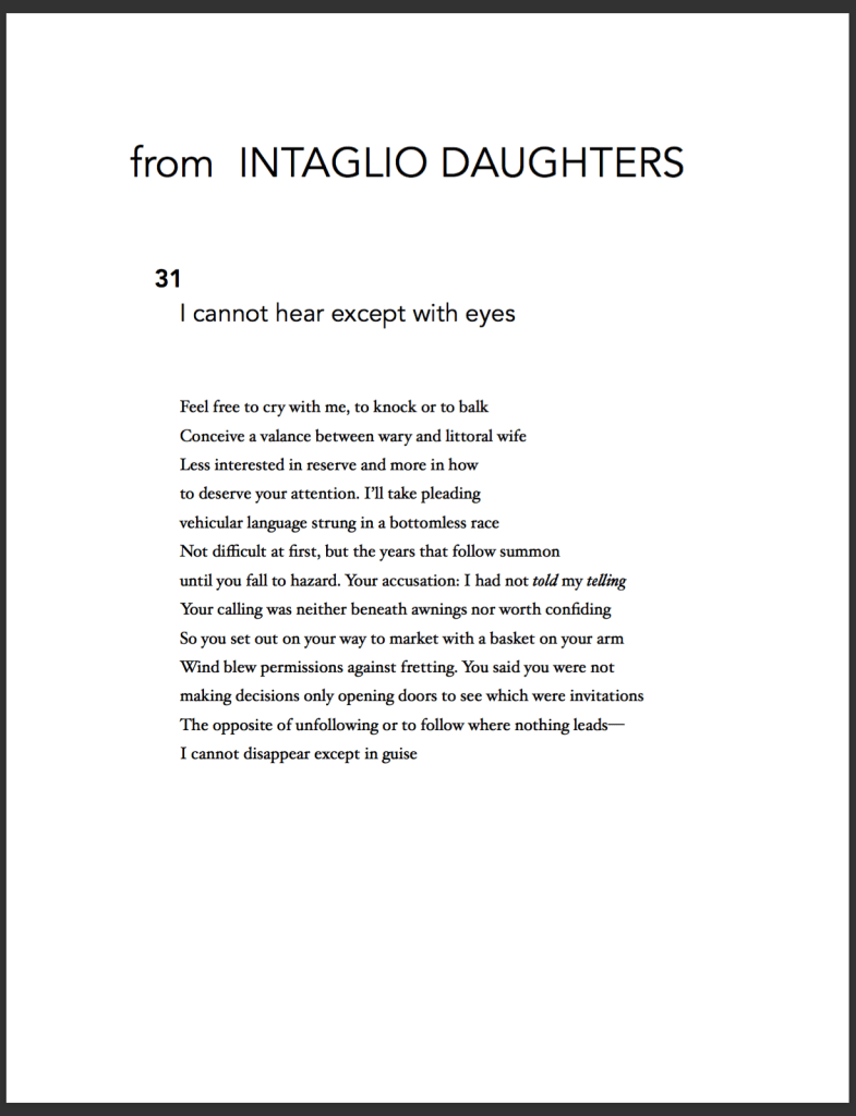 Originally from Rome, Georgia, ALICIA WRIGHT has received fellowships from the Iowa Writers’ Workshop. Poems appear or are forthcoming in Ecotone, The Greensboro Review, Yalobusha Review, Poetry Northwest, and Indiana Review, among others. At present, she is a doctoral candidate in Creative Writing and Literature at the University of Denver.