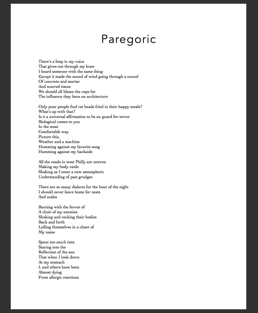 JASMINE GIBSON is a Philly jawn living in Brooklyn. She spends her time thinking about sexy things like psychosis, desire, and freedom. She is the author of Drapetomania (Commune Editions, 2015) and Don’t Let Them See Me Like This (Nightboat, 2018).