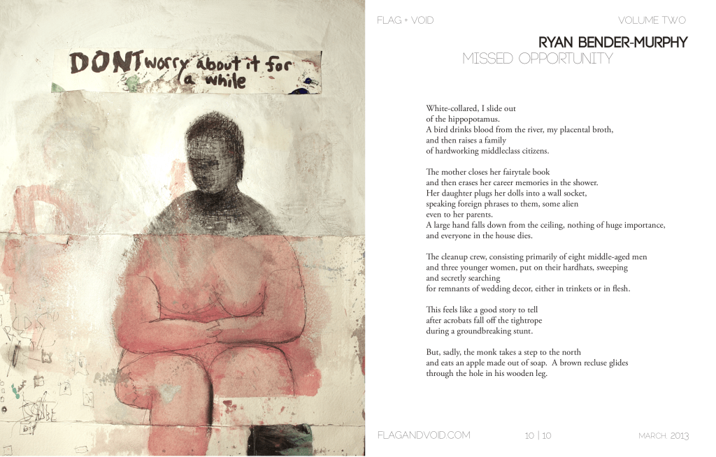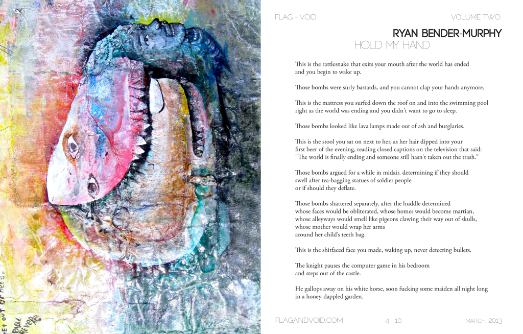 RYAN BENDER-MURPHY has poems in Anti-, The Bakery, Front Porch, NAP, Phantom Limb, Spork, and elsewhere. He lives in Austin, TX, where he teaches and surrenders. His chapbook First Man on Mars will be released fall 2013 by Phantom Limb Press.