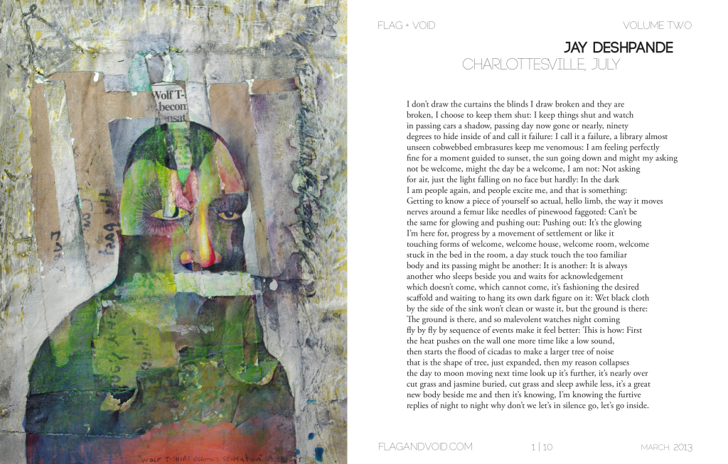 JAY DESHPANDE’s poems have recently appeared or are forthcoming in Washington Square, La Petite Zine, Narrative, Handsome, Shampoo, Spork, and elsewhere. He is the former poetry editor of AGNI and he curates the Metro Rhythm Reading Series in Brooklyn (metrorhythm.wordpress.com).