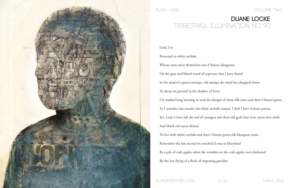 DUANE LOCKE lives in Tampa, Florida near anhingas, gallinules, alligators and the popularly most revered shrine in the city, the football stadium. He has had 6,699 poems published. 30 books. His latest (2012) Duane Locke: The First Decade, 1968-1978, 333 pages–a republication of his first 11 books. Order from publisher, Bitter Oleander Press, or Amazon (six reviews).
